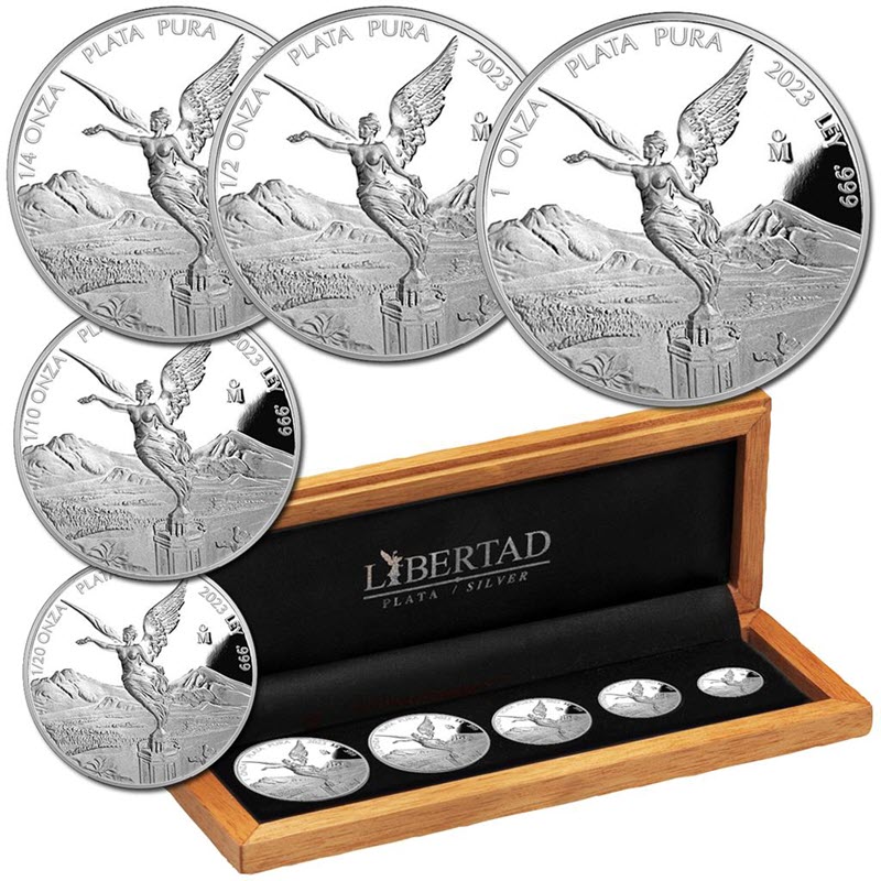 Набор из 5-ти серебряных монет Мексики "Либертад" (пруф), 59.09 г чистого серебра (проба 999)
