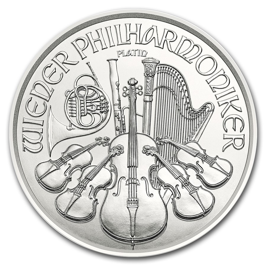 На реверсе платиновой монеты австрийский Филармоникер изображены различные музыкальные инструменты, такие как контрабас, виолончели, скрипки, фагот, арфа и труба. Сверху надпись – WIENER PHILHARMONIKER.