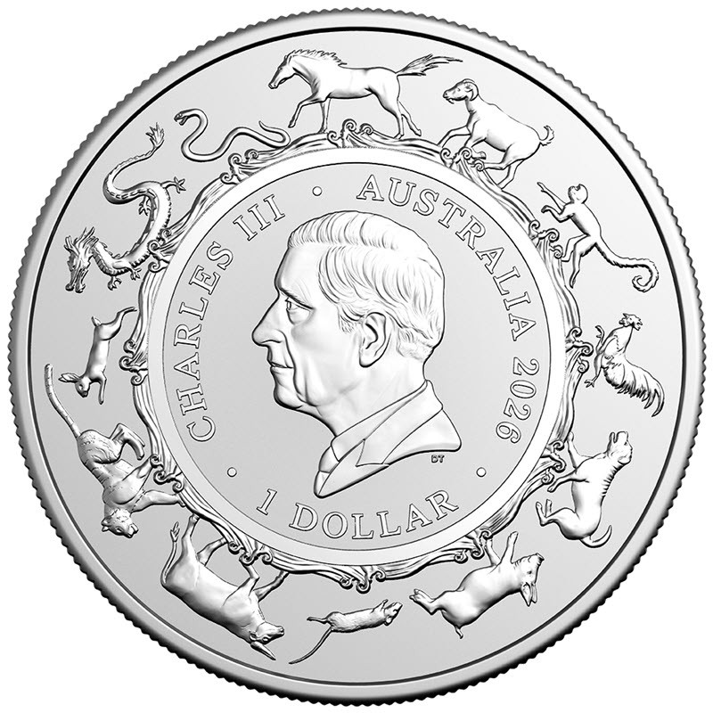 На аверсе изображен Его Величество король Чарльз III. Внизу портрета инициалы дизайнера TD (Dan Thorne). Вдоль канта надпись: CHARLES III · AUSTRALIA 2026 · 1 DOLLAR · (Чарльз III, страна-эмитент, год чеканки, номинал). Портрет и текст находятся в круге, по краю которого находятся двенадцать животных лунного календаря: змея,  дракон, кролик, тигр, бык, крыса, свинья, собака, петух, обезьяна, коза; лошадь вверху.