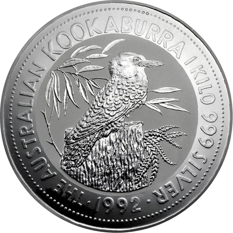 На реверсе изображена кукабарра, сидящая на пне в окружении листьев и папоротника. Вдоль канта надпись: THE AUSTRALIAN KOOKABURRA 1 KILO 999 SILVER · 1992 · (кукабарра, вес и проба серебра, год чеканки).