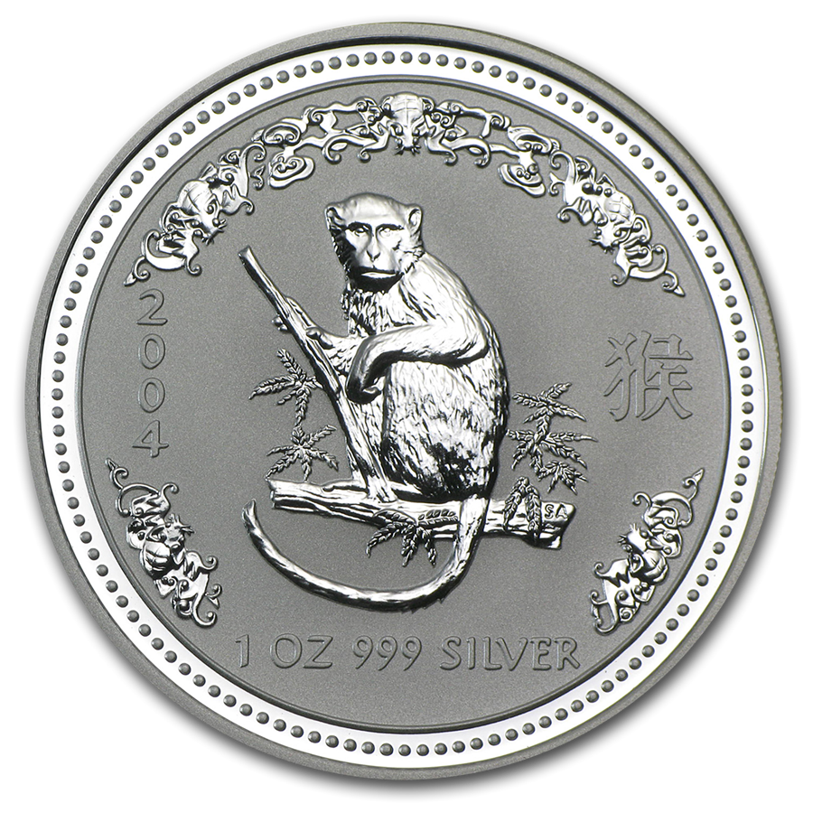 Серебряная монета Австралийский Лунар (первая серия монет) Год Обезьяны, выпущенная в Австралии Пертским монетным двором.