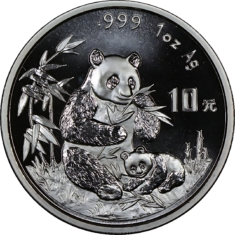 На реверсе изображены две панды на фоне зарослей бамбука: большая, жующая бамбук, а рядом её детёныш. Вверху надпись: .999 1oz Ag (проба и вес серебра). Справа: 10元 (номинал).