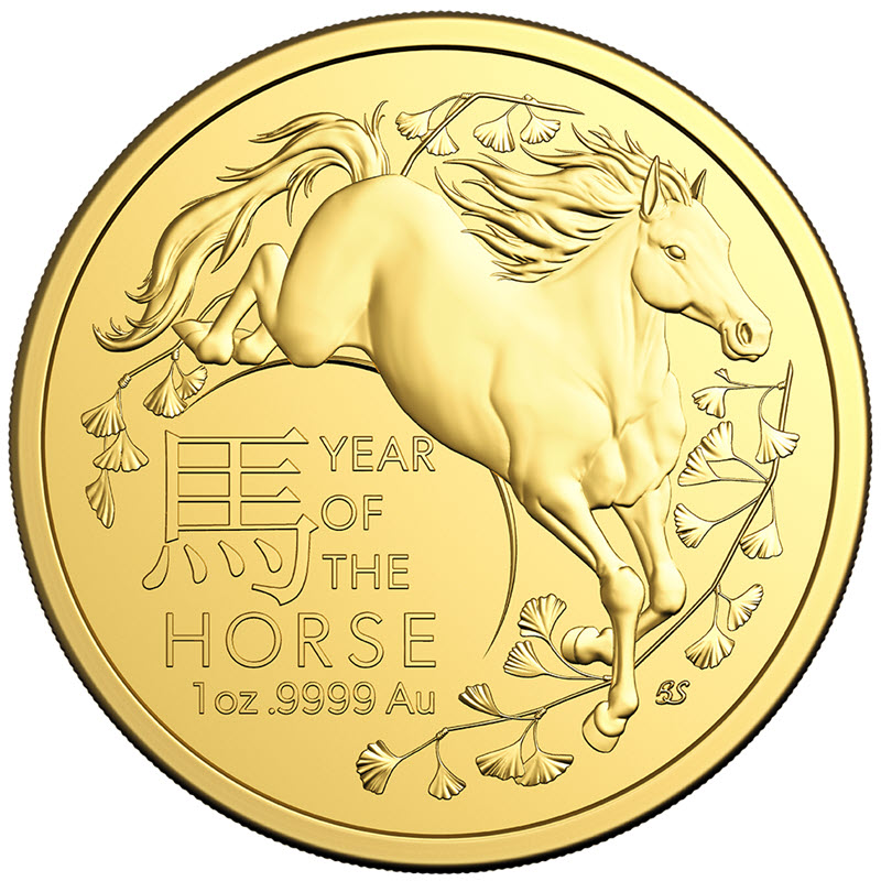 На реверсе изображена скачущая лошадь. Слева внизу надпись: 馬 YEAR OF THE HORSE 1 oz .9999 Au (год Лошади, вес и проба золота). Внизу справа инициалы дизайнера: BS (Bronwyn Scott).