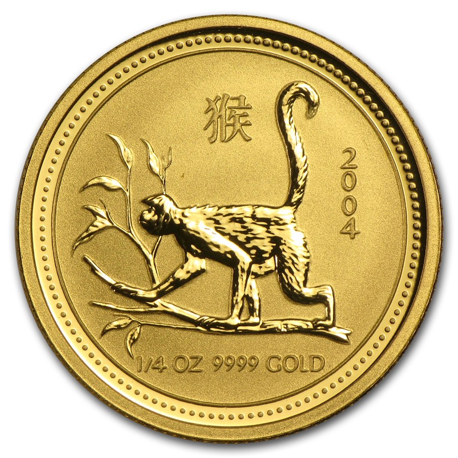 Ставшая уже памятной золотая монета Австралии - Лунар год Обезьяны 2004 весом 1/4 тройской унции. Это монета из первой двенадцатилетней серии австралийских монет, посвященной восточному лунному календарю. Выполнена из золота 9999 пробы, поэтому будет не только отличным подарком и дополнением коллекции, но и прекрасной инвестицией.