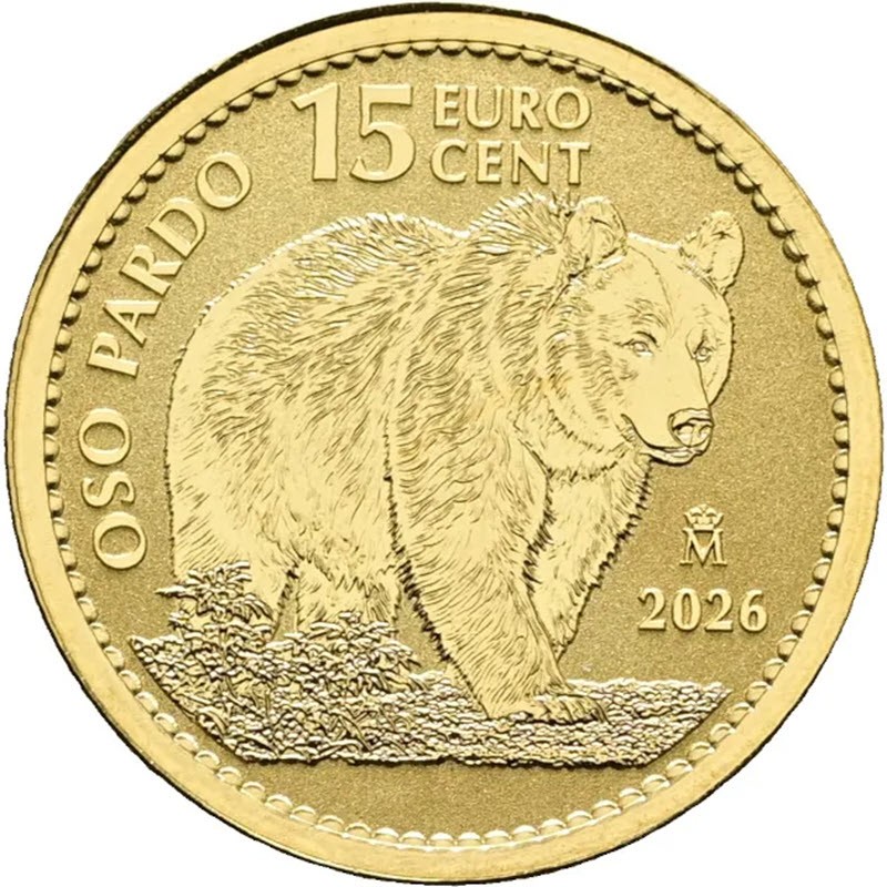 На реверсе изображен идущий бурый медведь. Справа от него: М 2026 (монограмма Королевского монетного двора Испании, год чеканки). Вдоль канта надпись: OSO PARDO 15 EURO CENT (бурый медведь, номинал).