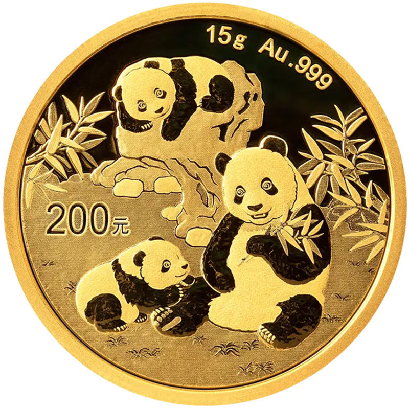На реверсе изображены мать и два детеныша панды на фоне камней и листьев бамбука. Вверху надпись: 15 g Au.999 (вес и проба золота), слева: 200 元 (номинал).