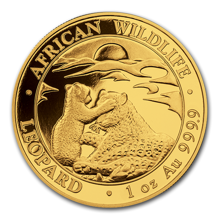 Золотая инвестиционная монета Сомали - Леопард (второй выпуск). Данная монета выпускается в рамках серии "Африканская дикая природа". Чеканка монеты производится на Баварском государственном монетном дворе.