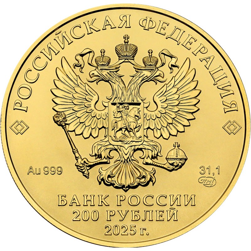 На аверсе в центре — рельефное изображение Государственного герба Российской Федерации, вверху вдоль канта надпись: РОССИЙСКАЯ ФЕДЕРАЦИЯ, обрамленная с обеих сторон сдвоенными ромбами, под гербом надпись: Au 999 31,1 ..МД (вес и проба золота, монограмма монетного двора), внизу надпись в три строки: БАНК РОССИИ 200 РУБЛЕЙ 2025 г. (банк, номинал, год чеканки).