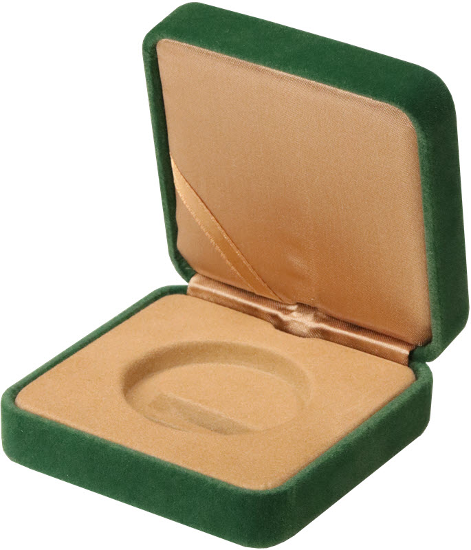 Подарочный бархатный футляр зеленого цвета для монет с капсулой диаметром 46 мм. Наружный размер: 80 Х 80 Х 35 мм. Флокированный ложемент бежевого цвета: 46 мм, глубина 6 мм.