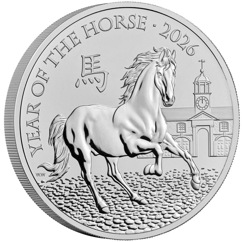 На реверсе изображена лошадь на фоне ратуши, отбивающими 12 часов. Вверху надпись: YEAR OF THE HORSE · 2026 馬 (Год Лошади, год чеканки). Слева у канта инициалы дизайнера: W.W (William Webb).