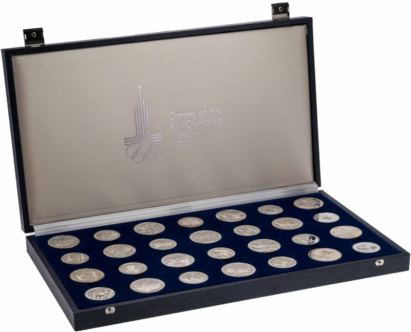 Этот чудесный набор из 28-и серебряных монет пробы 900 был выпущен в честь Олимпийских игр 1980 года в Москве. У них качество пруф, они помещены в оригинальный футляр с сертификатом подлинности. Тираж: 1500 штук.
