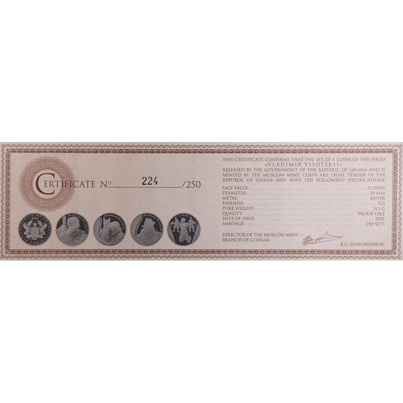 Набор из 4-х серебряных монет Ганы "Владимир Высоцкий" 2018 г.в., 4*31.1 г чистого серебра (проба 925)