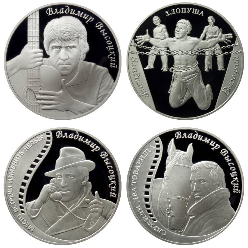 На реверсе монет изображения Владимира Высоцкого с гитарой, в роли Хлопуши в спектакле Театра на Таганке «Пугачев», в роли поручика Брусенцова в фильме «Служили два товарища», и легендарный Глеб Жеглов в фильме Станислава Говорухина «Место встречи изменить нельзя».