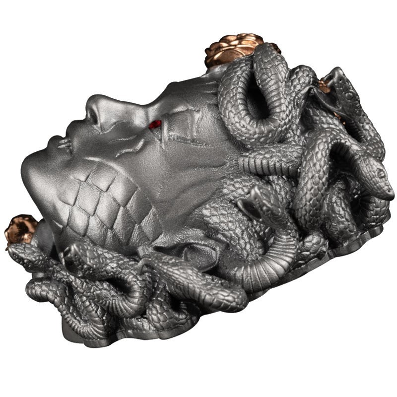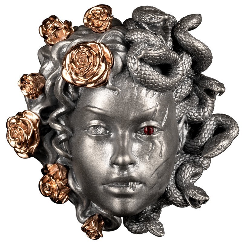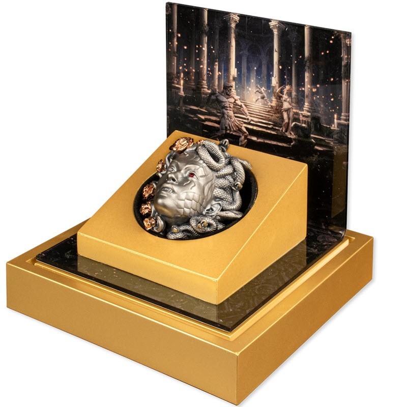 Эта фантастическая серебряная монета весом в 3 унции размером 40 Х 40 мм посвящена мифу о Медузе. Монета имеет античную отделку, замечательную необычную трехмерную форму, покрытие из розового золота и инкрустацию ярко-красным кристаллом! Она поставляется в роскошном футляре с сертификатом подлинности. Тираж: 499 штук.