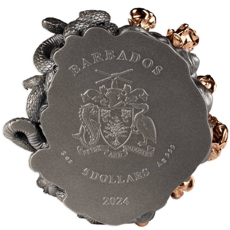 Серебряная монета Барбадоса "Медуза" 2024 г.в., 93.3 г чистого серебра (проба 999)