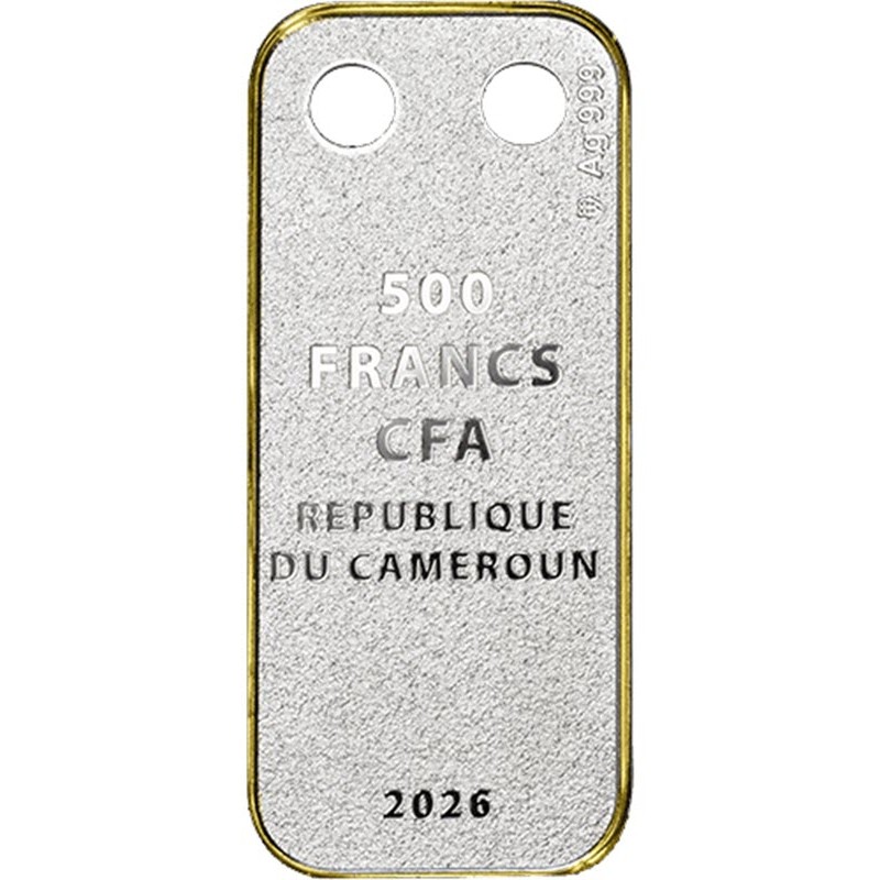 На аверсе справа вверху надпись: mw Ag 999 (монограмма польского монетного двора, проба серебра). Ниже надпись: 500 FRANCS CFA REPUBLIQUE DU CAMEROUN 2026 (номинал, страна-эмитент, год чеканки).