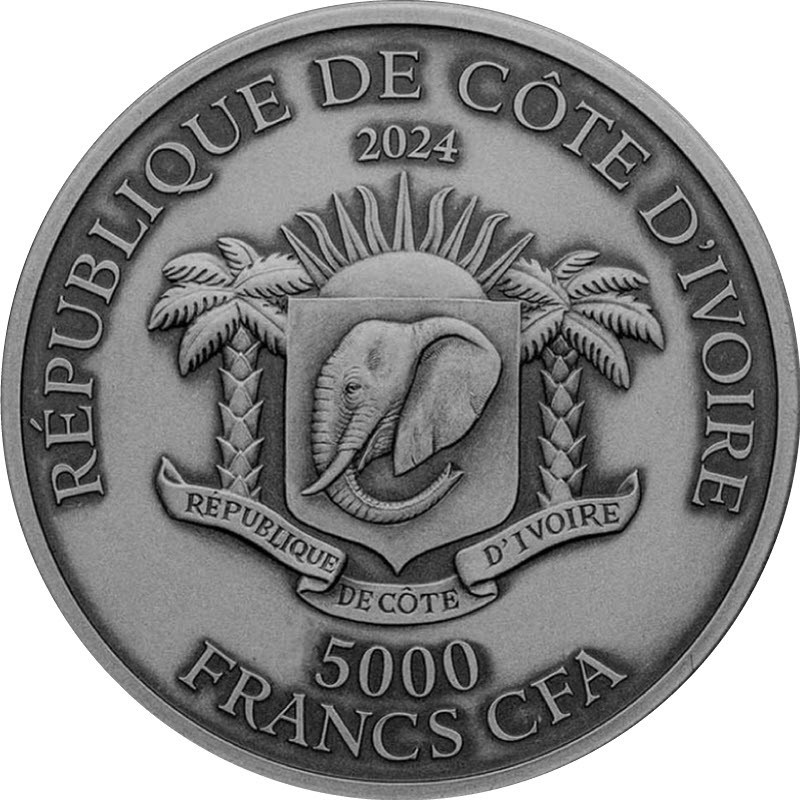 На аверсе изображен герб Кот-д’Ивуара. Вверху вдоль канта надпись: RÉPUBLIQUE DE CÔTE D'IVOIRE (страна-эмитент), под ней: 2024 (год чеканки). Внизу надпись в две строки: 5000 FRANCS CFA (номинал). На гурте выгравирован индивидуальный номер монеты.