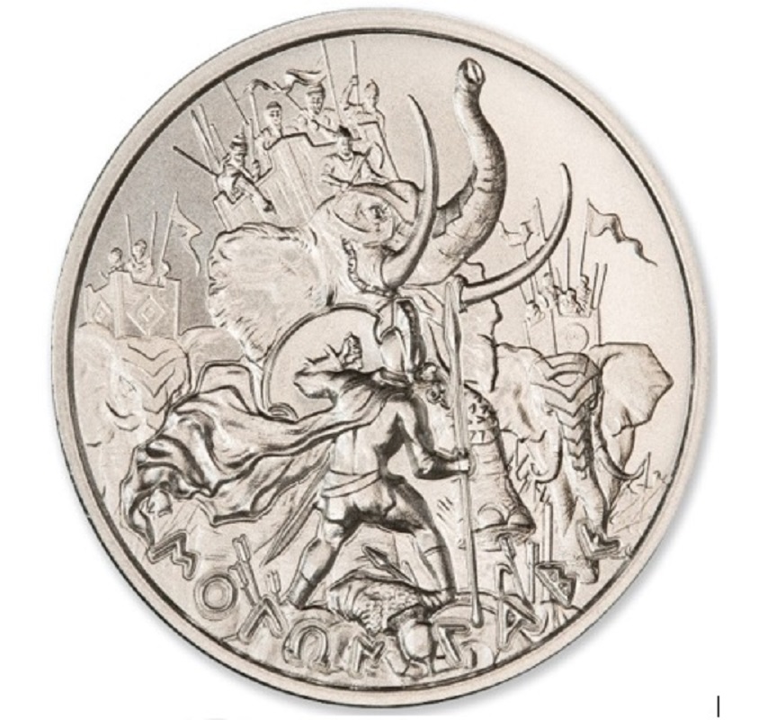 Серебряный жетон отчеканен частным американским монетным двором «Intaglio». «Молон Лабе», что означает «приди и возьми», - это традиционная греческая фраза, выражающая неповиновение, о которой говорил спартанский царь Леонидас, когда персидские армии требовали сдачи оружия