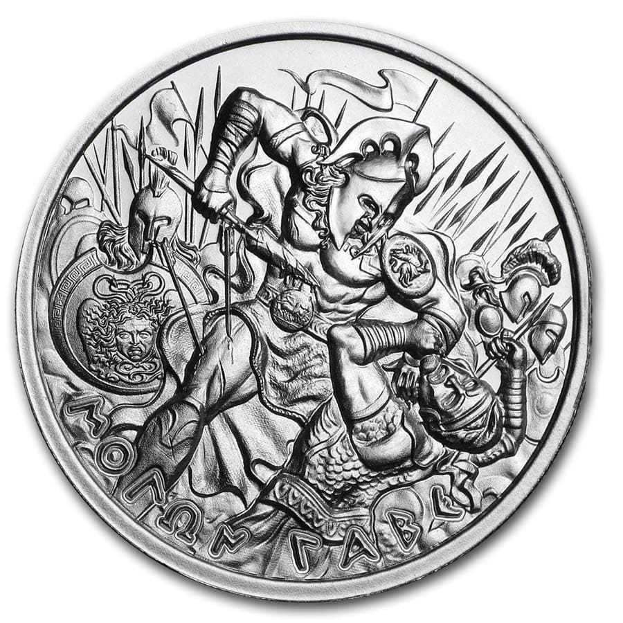 Серебряный жетон отчеканен частным американским монетным двором «Intaglio». «Молон Лабе», что означает «приди и возьми», - это традиционная греческая фраза, выражающая неповиновение, о которой говорил спартанский царь Леонидас, когда персидские армии требовали сдачи оружия