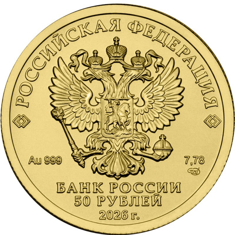 На аверсе в центре — рельефное изображение Государственного герба Российской Федерации, вверху вдоль канта надпись: РОССИЙСКАЯ ФЕДЕРАЦИЯ, обрамленная с обеих сторон сдвоенными ромбами, под гербом надпись: Au 999 7,78 ..МД (вес и проба золота, монограмма монетного двора), внизу надпись в три строки: БАНК РОССИИ 50 РУБЛЕЙ 2026 г. (банк, номинал, год чеканки).