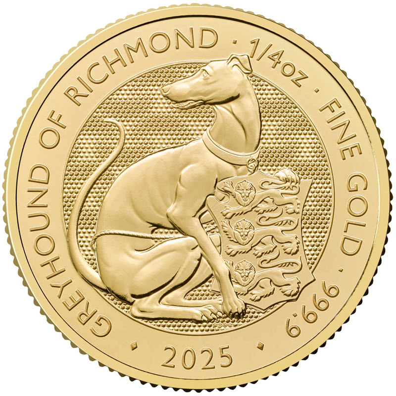 На реверсе изображена сидящая борзая, положившая лапу на щит с тремя львами Англии. У щита в верхнем углу выемка, куда упиралось копьё для атаки в рыцарских турнирах. Вдоль канта надпись: GREYHOUND OF RICHMOND · 1/4 oz · FINE GOLD · 999.9 · 2025 · (Грейхаунд Ричмонда, вес и проба золота, год чеканки). Внизу над датой инициалы дизайнера D.L (David Lawrence).