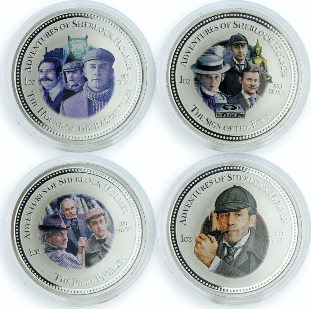 Набор серебряных монет, посвященный знаменитым кинофильмам о известном сыщике.