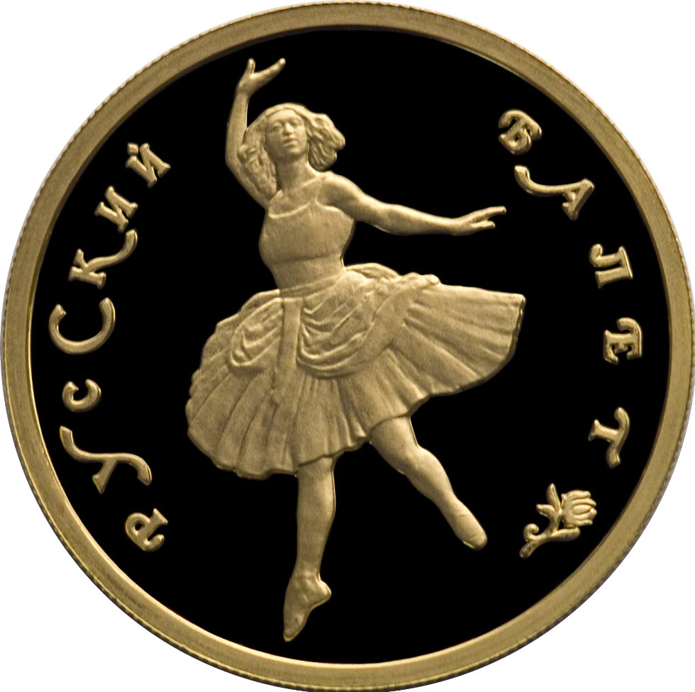 На реверсе изображение танцующей балерины, вдоль канта цветок и надпись: РУССКИЙ БАЛЕТ.