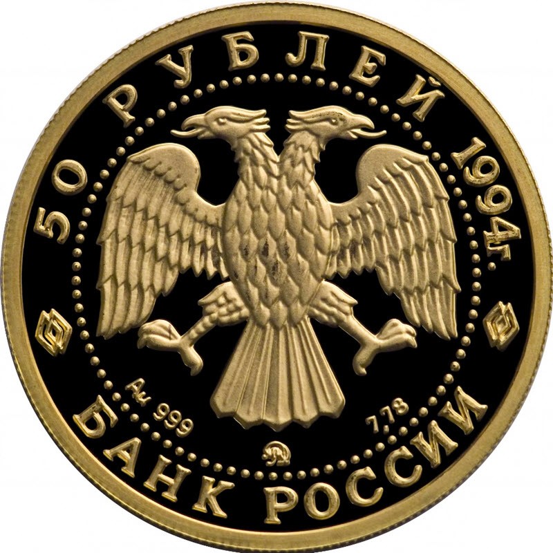 На аверсе вверху вдоль канта надпись: 50 рублей 1994г. (номинал и год чеканки), внизу: БАНК РОССИИ. В середине двуглавый орел, под ним Au 999, знак монетного двора «ММД», 7.78 (проба и вес золота).