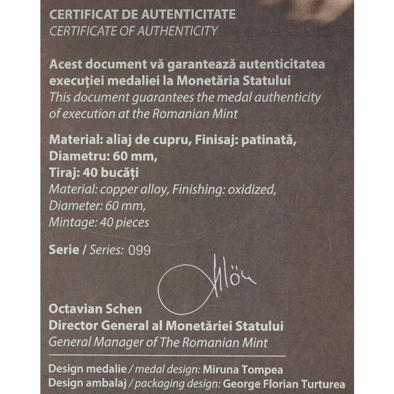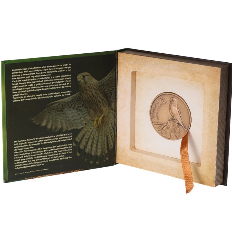 Эта медная медаль от Румынского монетного двора посвящена красной пустельге. У нее качество античной отделки, высокий рельеф и индивидуальный номер на гурте. Поставляется в оригинальном футляре с сертификатом подлинности. Тираж 100 штук.