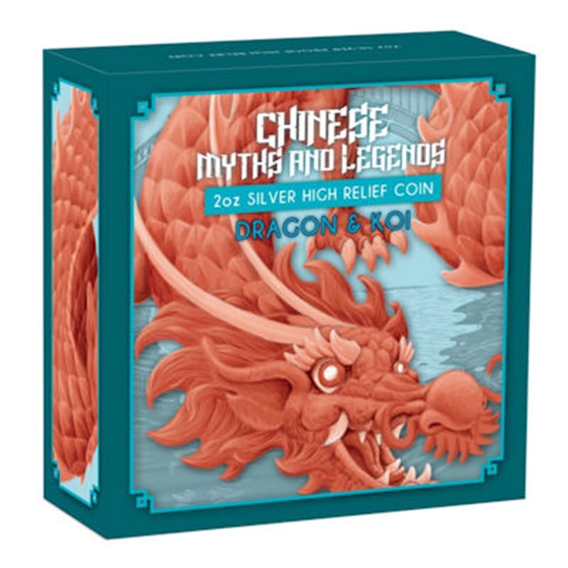 Серебряная монета из серии "Китайские мифы и легенды" от Пертского монетного двора Австралии весом в 1 тройскую унцию посвящена Дракону и Кои.