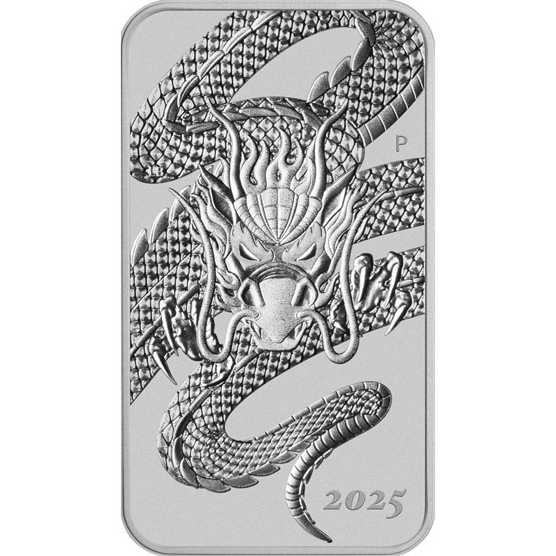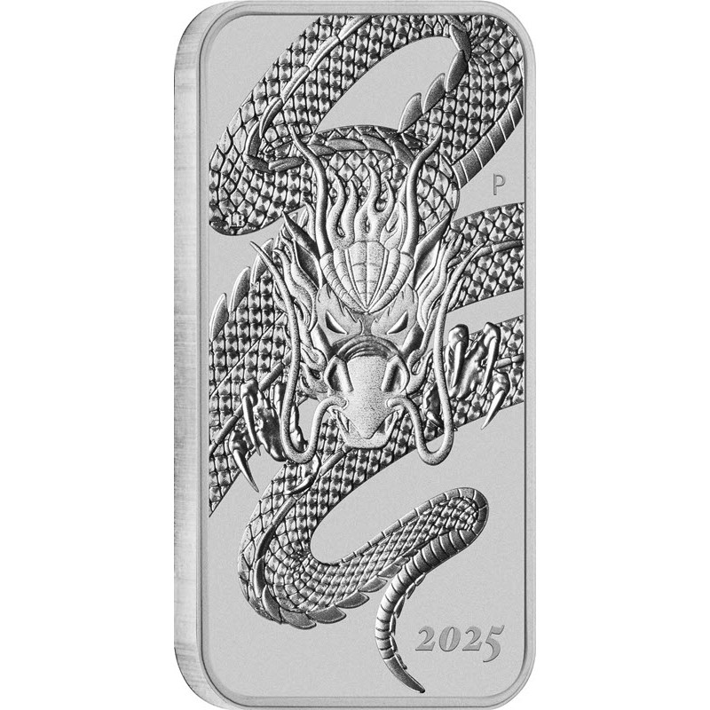 На реверсе изображен рычащий дракон с раскрытыми лапами. Вверху слева: LB (инициалы дизайнера Lucas Bowers), справа: Р монограмма Пертского монетного двора. Внизу справа: 2025 (год чеканки).