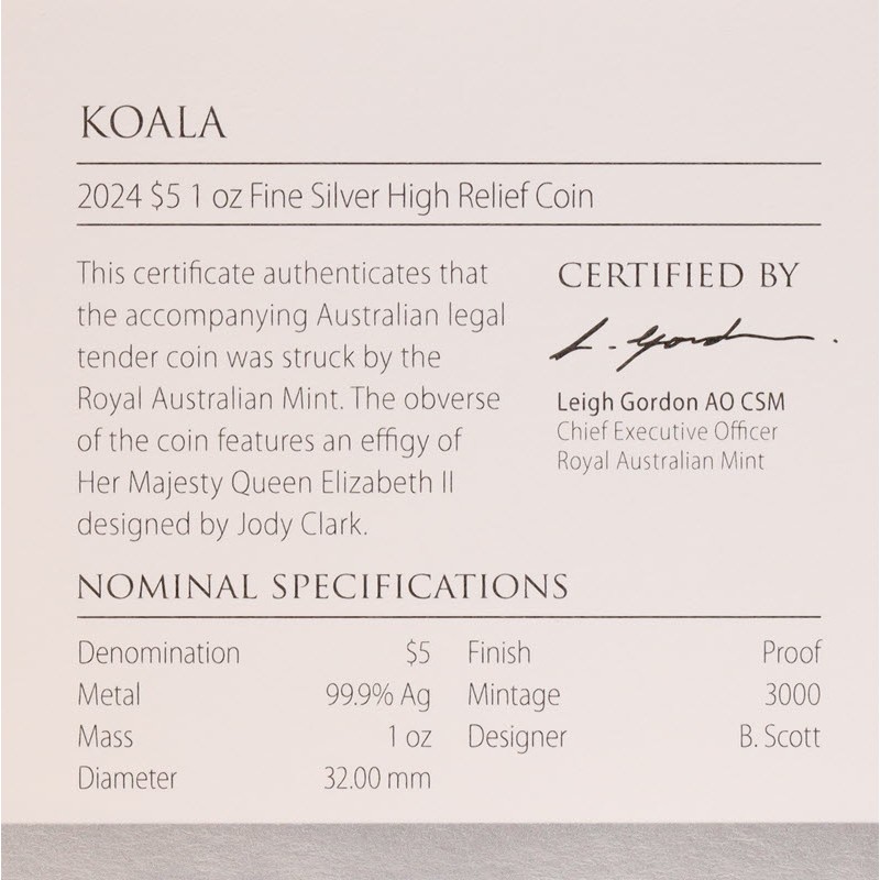 Серебряная монета Австралии "Коала" 2024 г.в. (высокий рельеф, пруф), 31.1 г чистого серебра (Проба 9999)