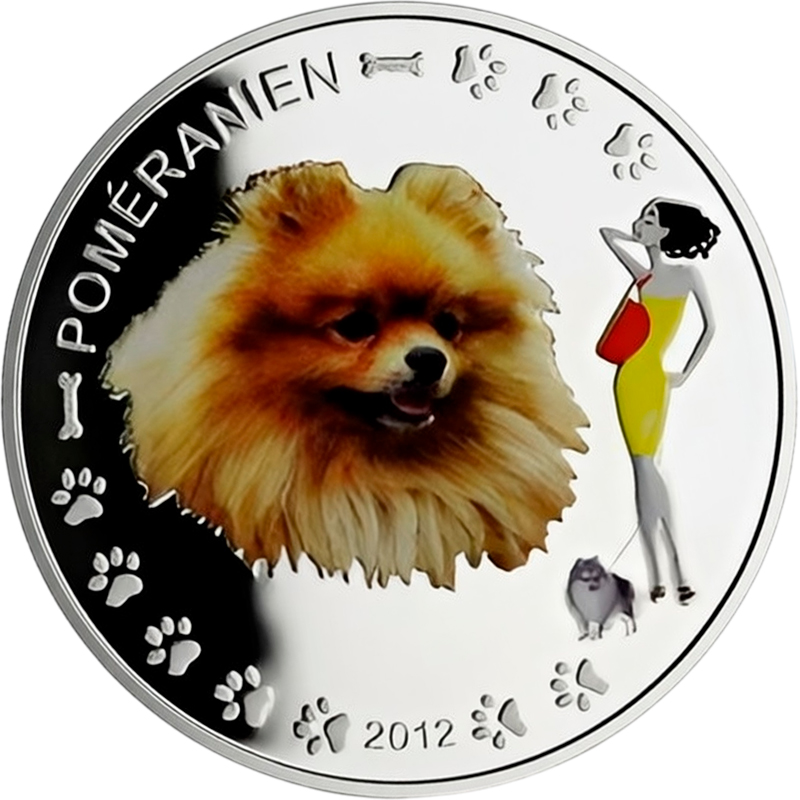 В центре - цветное стилизованное изображение померанского шпица. Справа - фигура девушки, держащей собаку на поводке. Фон украшен декоративными элементами в виде косточек и отпечатков лап. Вверху слева вдоль канта надпись POMÉRANIEN (Померанский шпиц), внизу – 2012 (год чеканки).