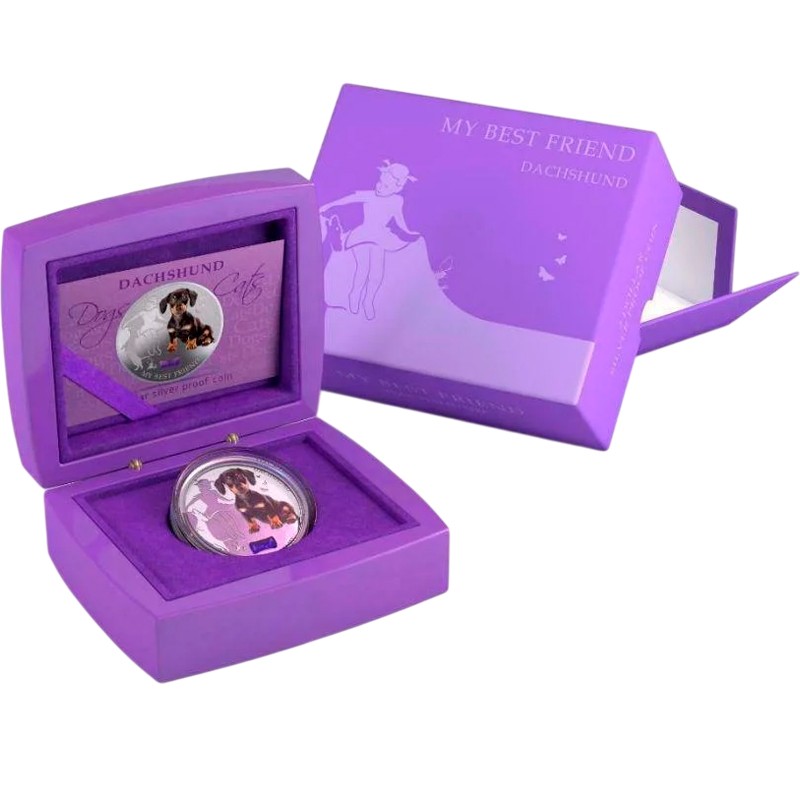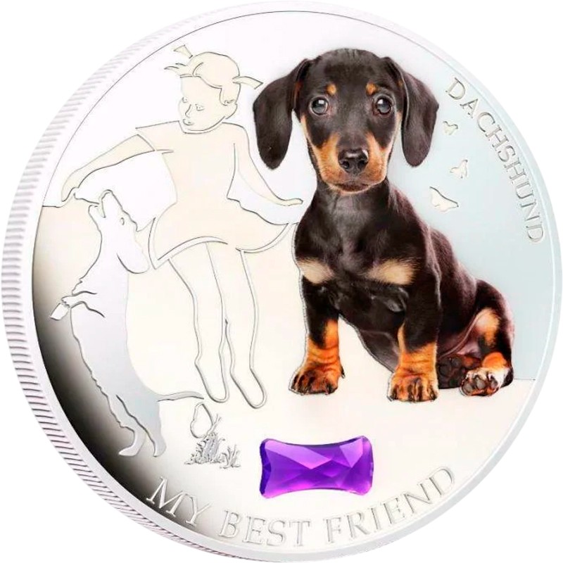 Эта чудесная серебряная монета весом 1 унция из серии «Собаки и кошки» (Dogs&Cats) посвящена собаке породы такса.