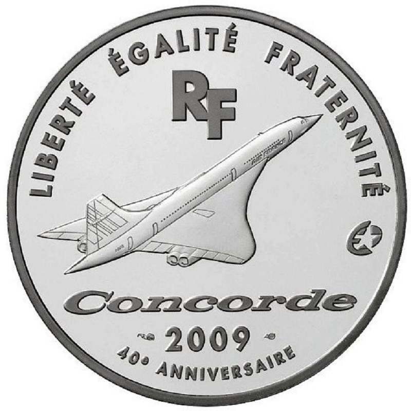 На аверсе нарисован «Конкорд» в полете. Надписи: сверху — «LIBERTÉ, ÉGALITÉ, FRATERNITÉ» («Свобода, Равенство, Братство») и «RF» (расшифровывается как «RÉPUBLIQUE FRANÇAISE»), снизу — «Concorde 40 Anniversaire». отчеканены также год чеканки и знаки монетного двора.