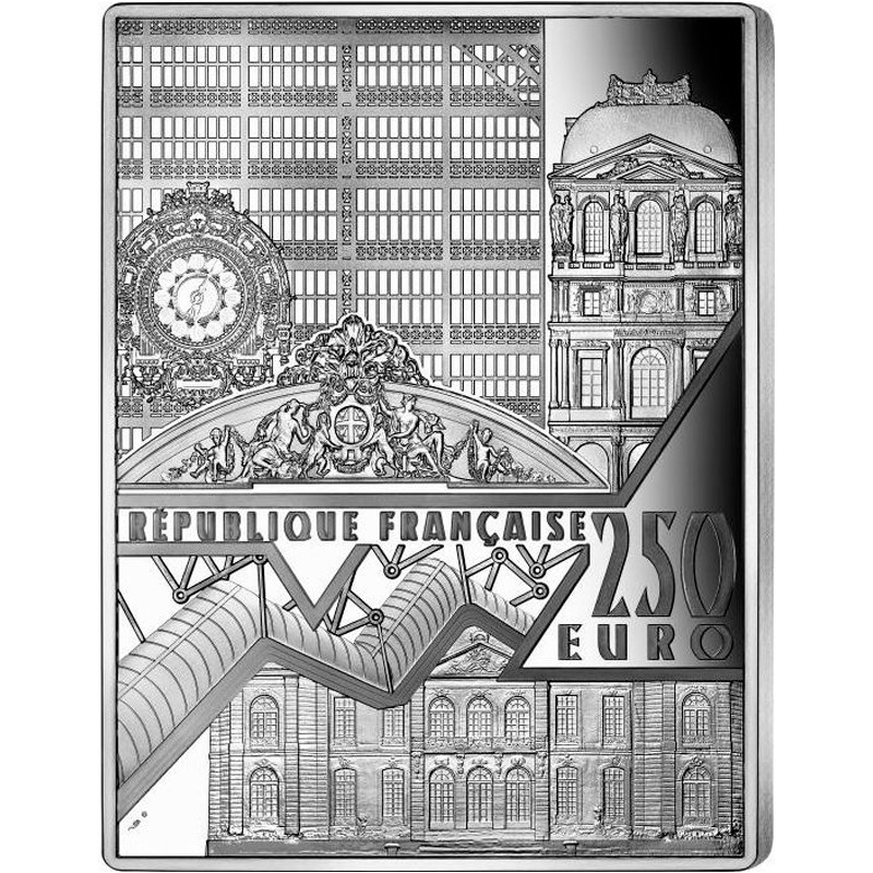Изображены архитектурные элементы крупнейших музеев Парижа: Музея Орсе, Центра Помпиду, Лувра и Музея Пикассо. В центре надпись -RÉPUBLIQUE FRANÇAISE 250 EURO (страна-эмитент, номинал) - разделяет верхнюю и нижнюю архитектурные композиции. Внизу слева – монограмма Парижского монетного двора и клеймо главного гравера.