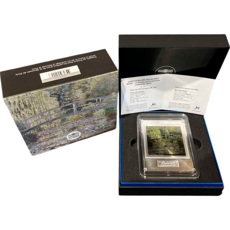 Эта чудесная серебряная монета Парижского монетного двора Франции в форме картины весом 500 грамм и размером 90X69 мм из серии «Шедевры музеев» (Masterpieces of Museum). На ней представлена цветная репродукция полотна Клода Моне «Пруд с кувшинками: Зеленая гармония» (1899).