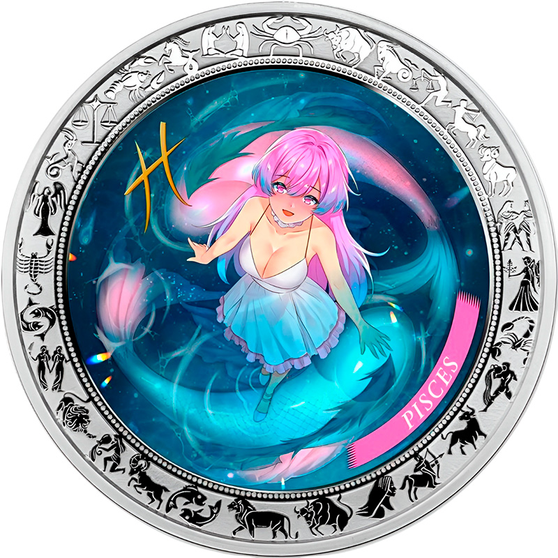 Эта красивая серебряная монета из серии “Аниме Зодиак“ посвящена двенадцатому астрологическому знаку зодиака - “Рыбы” (Pisces). Считается, что к нему принадлежат рождённые с 19 февраля по 20 марта. Хорошо развитая от природы интуиция позволяет Рыбам приспособиться к любому общественному порядку, быть своим в любой среде, находить наилучшие выходы из затруднительных положений.