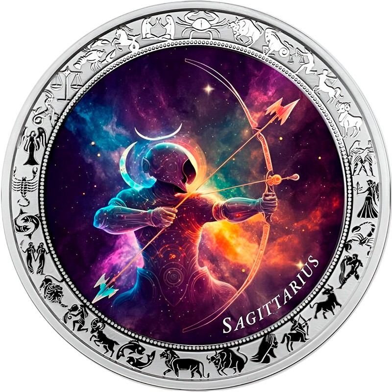 Эта красивая серебряная монета из серии “Космос Зодиак“ посвящена девятому астрологическому знаку зодиака - “Стрелец” (Sagittarius). Считается, что к нему принадлежат рождённые с 23 ноября по 21 декабря. Стрельцы очень дружелюбны, открыты в общении, любят помогать людям и заботиться об окружающих. Они стремятся к образованию, энергичны и почти всегда добиваются успеха хотя бы в одном из своих многочисленных видов деятельности.
