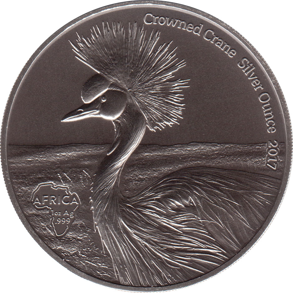 Изображение журавля на фоне африканской саванны, слева изображение африканского материка. Crowned Crane Silver Ounce 2017 — название монеты вес и год выпуска.