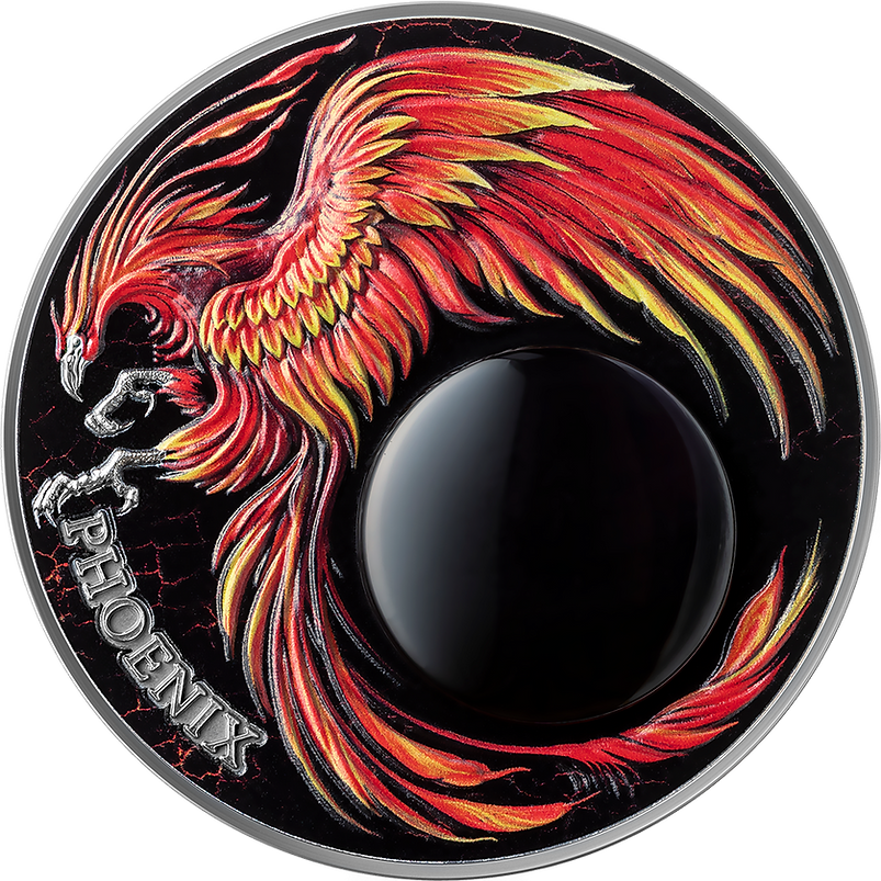 Эта замечательная серебряная монета весом 2 унции является первым выпуском серии "Хроники огня", посвященной Фениксу, мифической птице, которая, по преданию, живет несколько сотен лет, затем сгорает и возрождается из пепла. Монета имеет античное качество отделки, высокий рельеф, некоторые цветные участки и поразительную вставку из обсидиана. Она поставляется в великолепном футляре вместе с сертификатом подлинности. Ограниченный тираж 500 штук по всему миру.