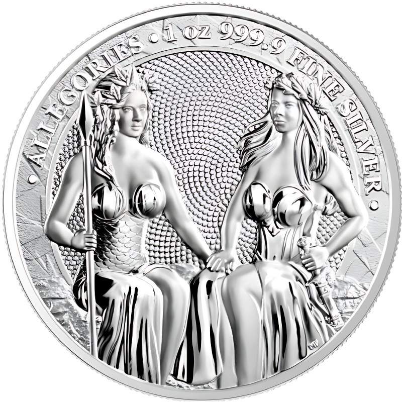 На реверсе изображены аллегорические образы Австрии и Германии в облике юных воительниц-красавиц. Женщина, представляющая Германию, вооружена копьём, символизирующим светлое начало, силу власти, достоинства и чести. Женщина, олицетворяющая Австрию, держит знаменитый меч «Reichschwert». На голове у неё лавровые листья — древний знак множества добродетелей, тогда как её соседка увенчана веточкой дуба, сопровождающий её образ с первых выпусков серии. Близкое расположение двух фигур показывает дружеские отношения культур обеих государств. Вверху вдоль канта надпись: ALLEGORIES 1 oz 999.9 FINE SILVER (Аллегории, вес и проба серебра)
