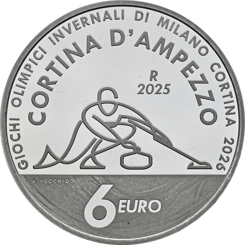 На реверсе изображена пиктограмма керлинга. Над пиктограммой надпись: CORTINA D'AMPEZZO R 2025(место проведения соревнований, монограмма римского монетного двора, год чеканки), внизу: A.VECCHIO (инициалы дизайнера Antonio Vecchio). Вдоль канта надпись: GIOCHI OLIMPICI INVERNALI DI MILANO CORTINA 2026 6 EURO (игры, номинал).