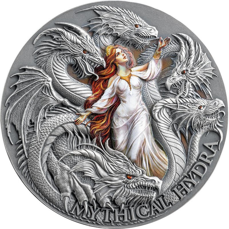 На реверсе изображена гидра с огненными глазами с девушкой, облаченной в эфирные одежды, которая олицетворяет торжество красоты над грозными невзгодами. Внизу надпись: MYTHICAL HYDRA.