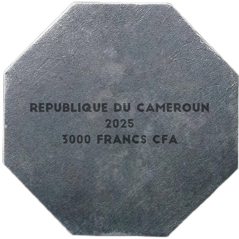 На аверсе надпись:  REPUBLIQUE DU CAMEROUN 2025 3000 FRANCS CFA (страна-эмитент, год чеканки, номинал).