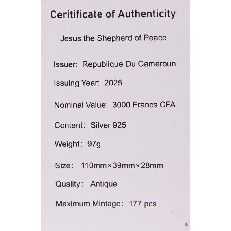 Серебряная монета Камеруна "Иисус. Пастырь мира" 2025 г.в., 89.7 г чистого серебра (проба 925)