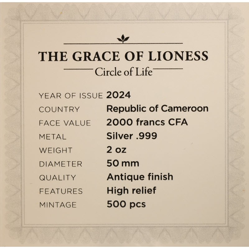 Эта красивая серебряная монета в 2 унции является первым выпуском серии "Круг жизни" и посвящена львице. Монета имеет прекрасные детали, качество античной отделки, имеет горельефы и поставляется в роскошном футляре вместе с сертификатом подлинности. Ограниченный тираж всего 500 штук по всему миру.
