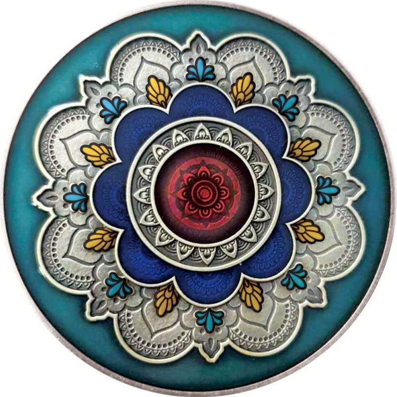 На реверсе монеты изображена мандала, украшенная горельефом и многоцветными эмалевыми вставками.