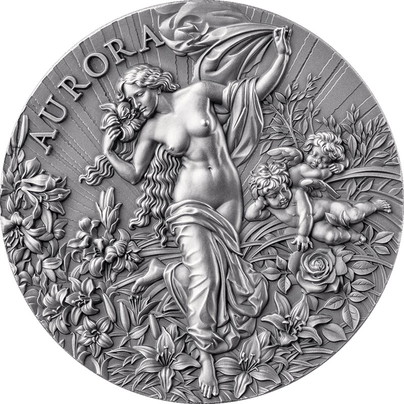На реверсе интерпретация картины Вильяма-Адольфа Бугро «Рассвет», изображающую Аврору на фоне цветущего сада, амуров в озарении первых лучей света. Вверху надпись: AURORA.