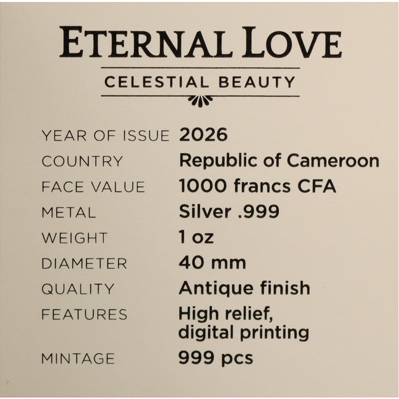 Серебряная монета Камеруна "Небесная красота. Вечная любовь" 2026 г.в., 31.1 г чистого серебра (проба 999)